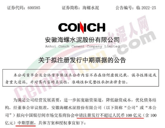海螺水泥于6月16日晚間發(fā)布公告稱,為滿足公司經(jīng)營發(fā)展需要,進一步拓寬融資渠道,降低融資成本,優(yōu)化債務(wù)結(jié)構(gòu),擬申請注冊發(fā)行不超過人民幣100億元中期票據(jù)。募集資金主要用于補充流動資金、償還有息債務(wù)和項目建設(shè)等符合國家法律法規(guī)規(guī)定的用途。