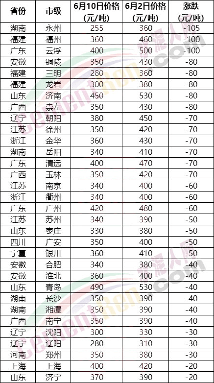 據(jù)水泥人網(wǎng)信息中心數(shù)據(jù),6月中上旬,三十多個地區(qū)水泥價格持續(xù)下滑,其中湖南永州水泥價格直降105元/噸,其次是福建福州和廣東云浮周降價100元/噸。