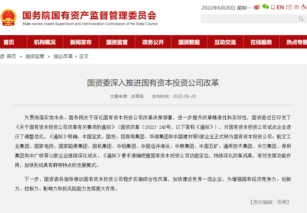 6月20日國資委官網(wǎng)發(fā)布《國資委深入推進(jìn)國有資本投資公司改革》稱,為貫徹落實(shí)黨中央、國務(wù)院關(guān)于深化國有資本投資公司改革決策部署,進(jìn)一步提升改革精準(zhǔn)性和實(shí)效性,國資委近日印發(fā)了《關(guān)于國有資本投資公司改革有關(guān)事項(xiàng)的通知》(國資改革〔2022〕245號,以下簡稱《通知》),對國有資本投資公司試點(diǎn)企業(yè)進(jìn)行了調(diào)整優(yōu)化。