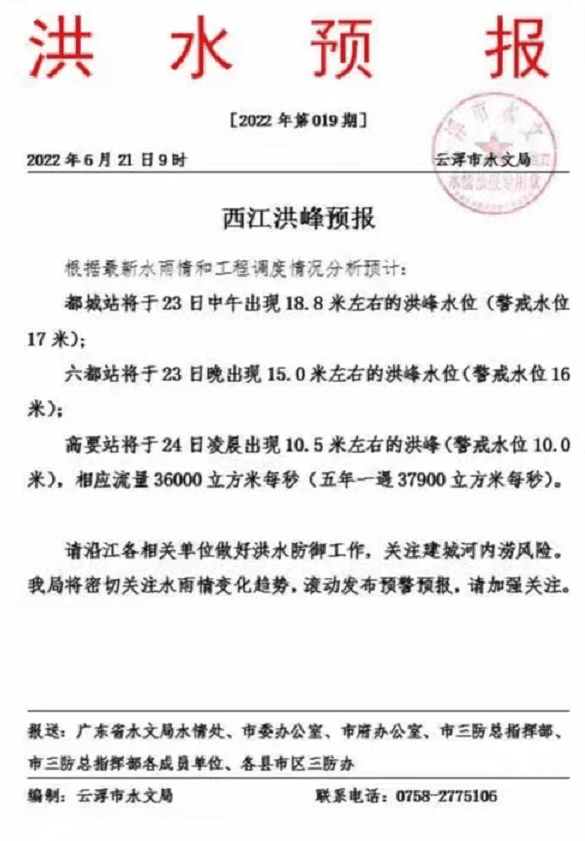 云浮市水文局發(fā)《洪水預報》稱, 根據(jù)最新水雨情和工程調(diào)度情況分析預計:都城站將于23日中午出現(xiàn)188米左右的洪峰水位(警戒水位17米);六都站將于23日晚出現(xiàn)150米左右的洪峰水位(警戒水位16米);高要站將于24日凌晨出現(xiàn)105米左右的洪峰(警戒水位10.0米),相應流量36000立方米每秒(五年一遇37900立方米每秒)。請沿江各相關單位做好洪水防御工作,關注建城河內(nèi)澇風險。