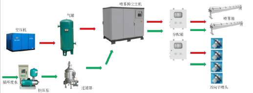 該系統(tǒng)通過空壓機制造壓縮空氣,輸送至儲氣罐,儲氣罐可保持壓縮空氣壓力恒定,將恒定的壓縮空氣輸送至噴霧抑塵主機,水泥廠水管網(wǎng)會有大量循環(huán)廢水,不能隨意排放,噴霧抑塵技術(shù)可以將其利用,將循環(huán)廢水輸送至恒壓泵,加壓后經(jīng)過過濾雜質(zhì),輸送給噴霧抑塵主機,經(jīng)噴霧抑塵主機調(diào)配壓力處理后,將壓縮空氣和水輸送給分配器,分配器再將壓縮空氣和水分別輸送給噴霧箱和萬向節(jié)噴頭。特制的雙流體噴頭,利用超聲波產(chǎn)生的微細(xì)水霧(10微米左右)捕集凝聚微細(xì)粉塵,將粉塵直接抑制在起塵點,避免了揚塵的出現(xiàn),使粉塵得到有效控制。既能保證揚塵的治理效果,也不會顯著增加產(chǎn)塵物料的濕含量,還能處理掉水泥廠的循環(huán)廢水。