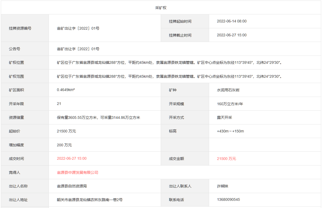 該礦區(qū)位于廣東省翁源縣鐵龍鎮(zhèn)將軍屯,礦區(qū)面積0.4649平方公里,開采標高430米至150米,開采方式為露天開采,開采礦種水泥用灰?guī)r、熔劑用白云巖、建筑石料用灰?guī)r。其中,礦區(qū)范圍內(nèi)保有建筑用石灰?guī)r礦石量1948.68萬立方米(5339.38萬噸),可開采建筑石料用灰?guī)r礦1644.68萬立方米(4506.42萬噸)。生產(chǎn)規(guī)模160萬立方米/年,建筑石料用灰?guī)r礦生產(chǎn)規(guī)模為86萬立方米/年,出讓年限21年(含基建期0.5年,閉坑修復期0.5年)。最終翁源縣中原發(fā)展有限公司以2.15億元競得該采礦權。公告顯示,采礦權競得人需承擔其他費用17000萬元,主要用于鐵龍工業(yè)運輸專用通道(含3.281公里礦區(qū)公路)建設、村民搬遷賠付與礦區(qū)周邊環(huán)境整治。此外,競得人在礦產(chǎn)開采過程中若發(fā)現(xiàn)地下不可移動文物,必須及時上報文物行政主管部門,確保文物安全不受影響。據(jù)悉,翁源縣中原發(fā)展有限公司為合資公司,由南方水泥資產(chǎn)經(jīng)營有限公司和中建材投資有限公司合資控股,其中南方水泥持股51%,中建材投資有限公司持股49%。