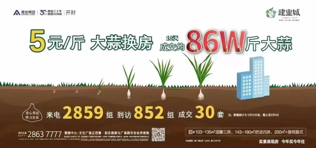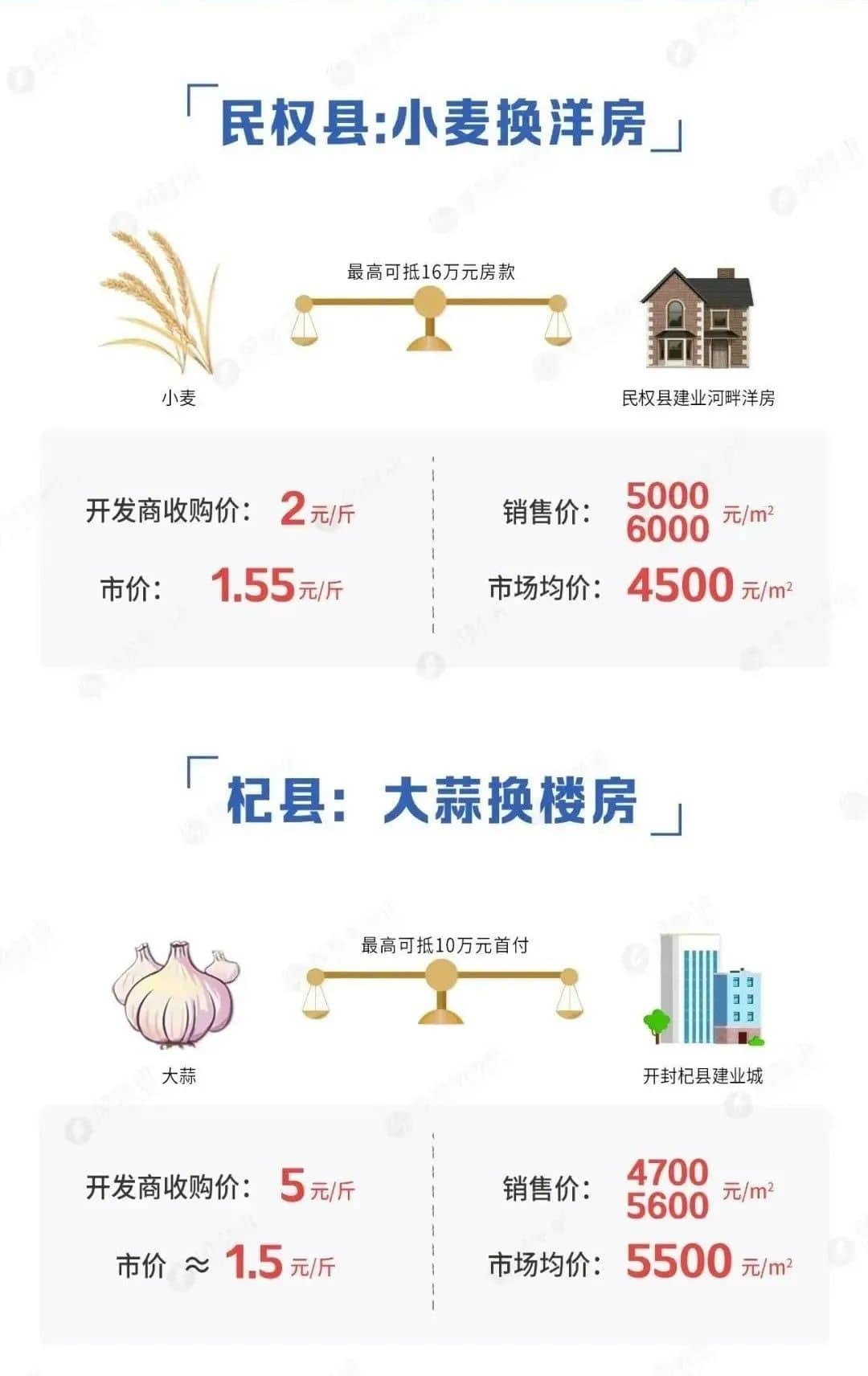河南商丘民權縣建業(yè)地產(chǎn)的一個樓盤就以 “愛心助農(nóng)”的口號,高價收高小麥抵首付,2元/斤,最高可抵 16萬房款。建業(yè)地產(chǎn)在河南開封杞縣還推出了大蒜抵房款。
