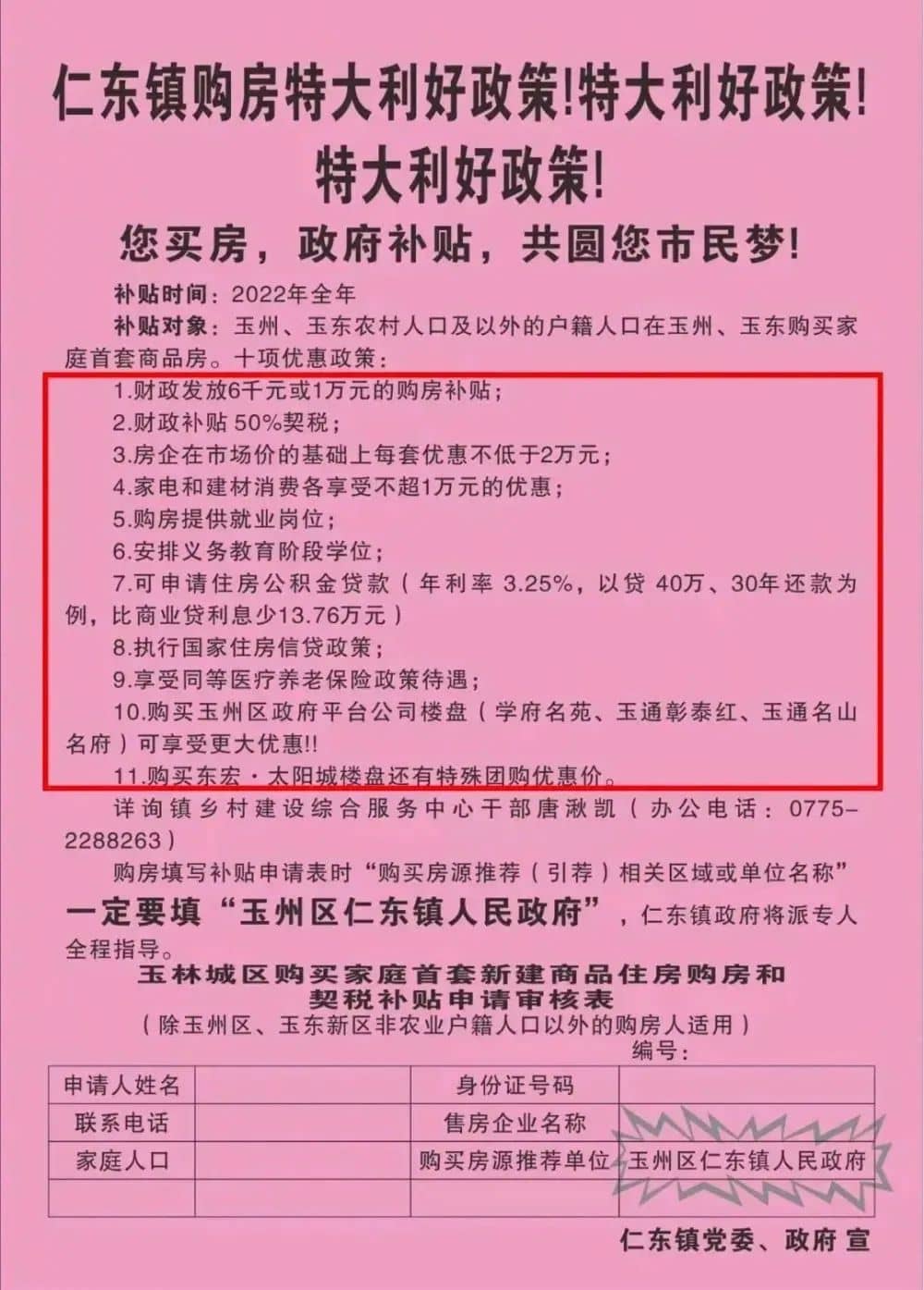 玉林市玉州區(qū)仁東鎮(zhèn)黨委、政府發(fā)購房特大利好政策。購房填寫補貼申請表時“購買房源推薦(引薦)相關區(qū)域或單位名稱”一定要填“玉州區(qū)仁東鎮(zhèn)人民政府”,仁東鎮(zhèn)政府將派專人全程指導。