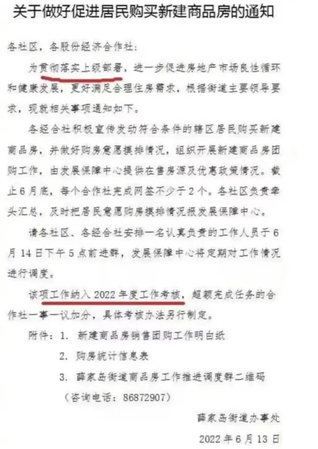 山東青島把賣房納入了工作人員考核范圍之內(nèi),比如青島市西海岸新區(qū)某街道辦事處一則名為《關于做好促進居民購買新建商品房的通知》廣為流傳。通知要求各社區(qū)、各股份經(jīng)濟合作社,發(fā)動轄區(qū)居民購買新建商品房,組織新建商品房團購,至6月底每個合作社完成網(wǎng)簽不少于2個,并將該項工作納入2022年度工作考核。對此社區(qū)工作人員表示,“完不成的話,我們社區(qū)是要扣分的,社區(qū)書記也是有可能要被扣錢的。”
