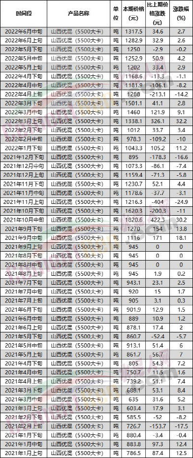 國家統(tǒng)計局最新公布的6月中旬流通領域山西優(yōu)混(5500大卡)煤炭市場價格為市場價格為1317.5元/噸,較上年同期889元/噸,上漲了428.5元/噸,漲幅48%。