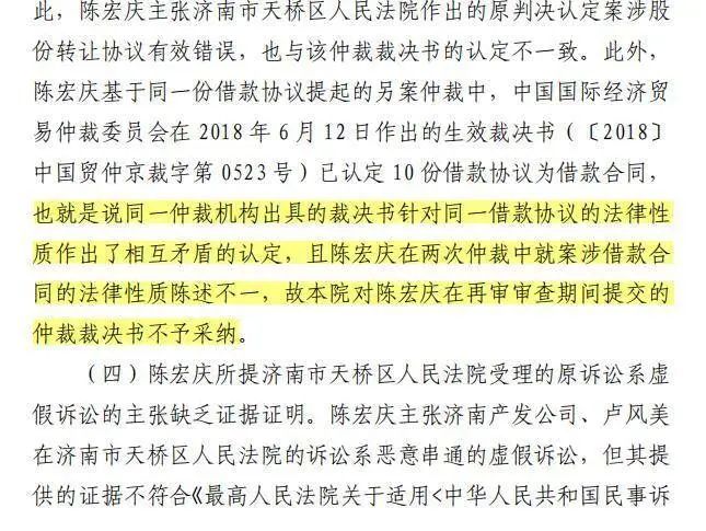 記者獲取的裁定書(shū)顯示,對(duì)于貿(mào)仲會(huì)在2018年6月12日、2022年2月22日所做的兩份裁決,山東省高院認(rèn)為:“同一仲裁機(jī)構(gòu)出具的裁決書(shū)針對(duì)同一借款協(xié)議的法律性質(zhì)作出了相互矛盾的認(rèn)定,且陳宏慶在兩次仲裁中就案涉借款合同的法律性質(zhì)陳述不一,故本院對(duì)陳宏慶在再審審查期間提交的仲裁裁決書(shū)不予采納。”