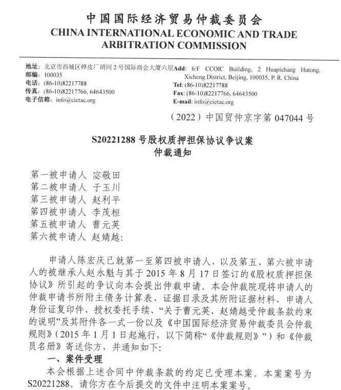 蓋有貿(mào)仲會(huì)藍(lán)色印章的仲裁通知顯示,6月23日,貿(mào)仲會(huì)確認(rèn)收到陳宏慶對(duì)宓敬田、于玉川等六人提起仲裁的相關(guān)文件以及仲裁預(yù)付金。