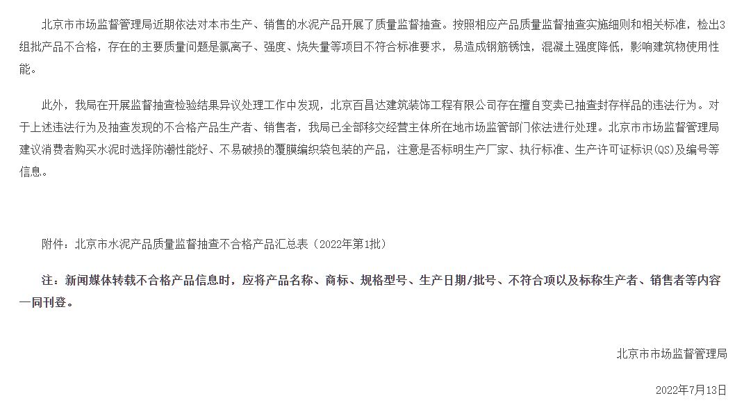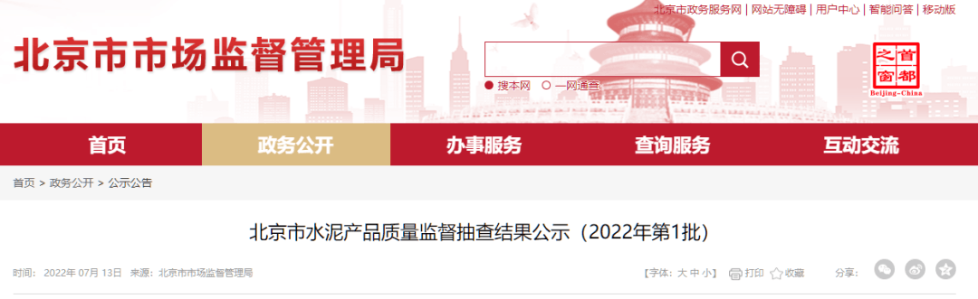 7月13日,北京市市場(chǎng)監(jiān)督管理局公布了《北京市水泥產(chǎn)品質(zhì)量監(jiān)督抽查結(jié)果公示(2022年第1批)》。