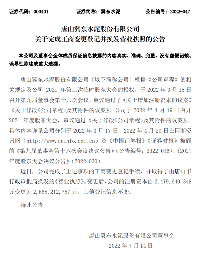 唐山冀東水泥股份有限公司根據(jù)《公司章程》的相關規(guī)定及公司2021年第二次臨時股東大會的授權,于2022年3月15日召開第九屆董事會第十六次會議,審議通過了《關于增加注冊資本的議案》《關于修改<公司章程>及其附件的議案》,公司于2022年4月19日召開2021年度股東大會,審議通過《關于修改<公司章程>及其附件的議案》,具體內(nèi)容詳見公司分別于2022年3月17日、2022年4月20日在巨潮資訊網(wǎng)及《中國證券報》《證券時報》披露的《第九屆董事會第十六次會議決議公告》(公告編號:2022-016)、《2021年度股東大會決議公告》(2022-030)。