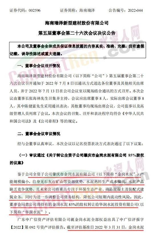 7月13日,海南瑞澤發(fā)布公告,鑒于公司全資子公司肇慶市金崗水泥有限公司(以下簡稱“金崗水泥”)產能規(guī)模偏小,自身無石灰石礦山等資源優(yōu)勢,水泥熟料生產成本偏高,水泥產品缺乏競爭優(yōu)勢,且未來公司將重點專注于環(huán)保生態(tài)產業(yè)、商品混凝土及裝配式建筑業(yè)務;同時為進一步調整公司債務結構,降低公司短期內流動性風險。因此,董事會同意公司將持有的金崗水泥85%的股權轉讓給華潤水泥投資有限公司。