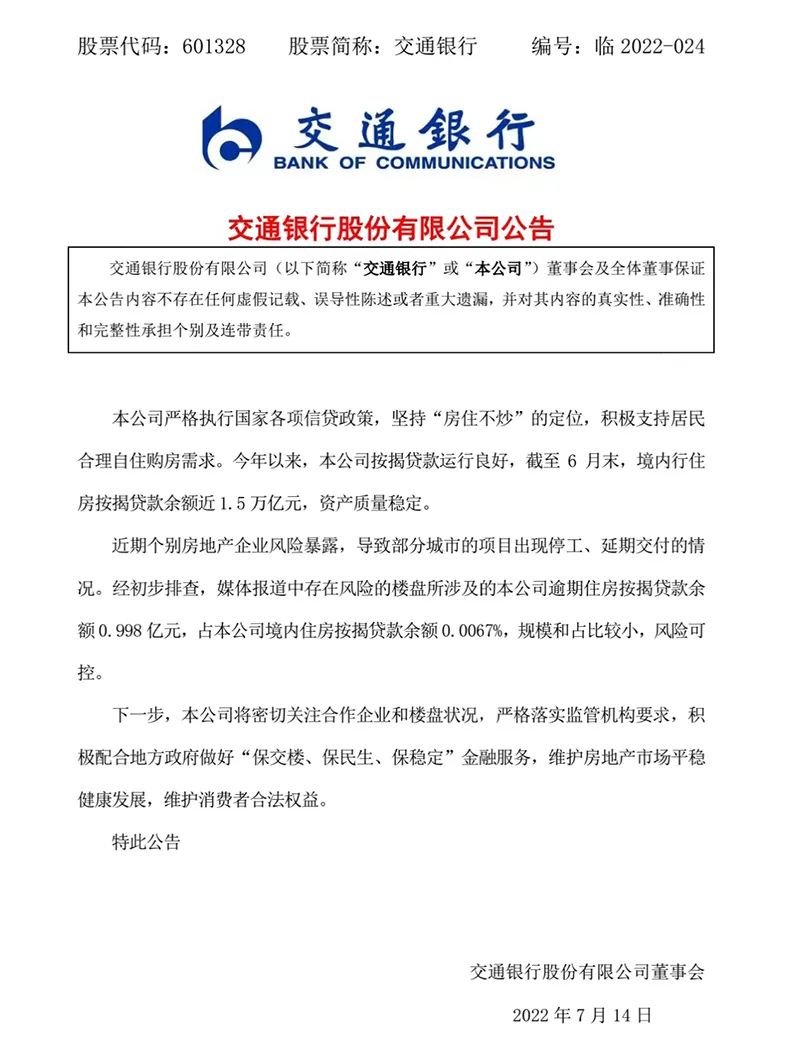 交通銀行公告表示,該行嚴格執(zhí)行國家各項信貸政策,堅持“房住不炒”的定位,積極支持居民合理自住購房需求。今年以來,該行按揭貸款運行良好,截至6月末,境內(nèi)行住房按揭貸款余額近1.5萬億元,資產(chǎn)質(zhì)量穩(wěn)定。