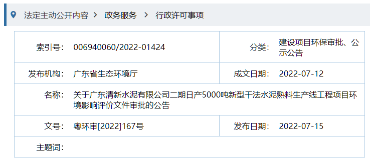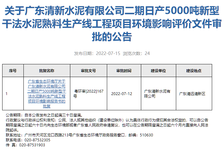 日前,廣東生態(tài)環(huán)境廳發(fā)布《關(guān)于廣東清新水泥有限公司二期日產(chǎn)5000噸新型干法水泥熟料生產(chǎn)線工程項(xiàng)目環(huán)境影響評價文件審批的公告》提到廣東清新水泥有限公司報批的《廣東清新水泥有限公司二期日產(chǎn) 5000 噸新型干法水泥熟料生產(chǎn)線工程項(xiàng)目環(huán)境影響報告書》(以下簡稱報告書)等材料收悉。