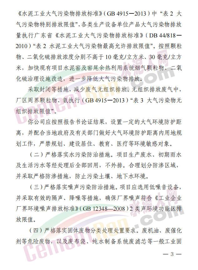 (一)嚴(yán)格落實(shí)大氣污染防治措施。項(xiàng)目各工序產(chǎn)生的廢氣應(yīng)有效收集處理,各排氣筒高度不低于報告書建議值。本項(xiàng)目水泥窯及窯尾余熱利用系統(tǒng)煙氣顆粒物、二氧化硫、氮氧化物排放濃度應(yīng)分別不高于 10 毫克/立方米、30 毫克/立方米、50 毫克/立方米。