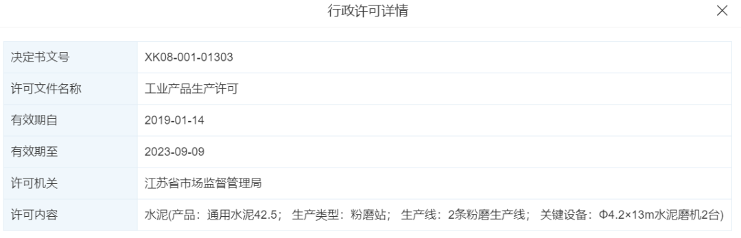 企業(yè)生產(chǎn)許可證編號(hào):XK08-001-01303,產(chǎn)品明顯顯示,水泥(產(chǎn)品:通用水泥42.5;生產(chǎn)類(lèi)型:粉磨站;生產(chǎn)線:2條粉磨生產(chǎn)線;關(guān)鍵設(shè)備:Φ4.2×13m水泥磨機(jī)2臺(tái)。