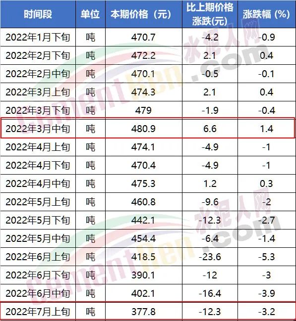 國(guó)家統(tǒng)計(jì)局流通領(lǐng)域價(jià)格信息顯示,P.O 42.5散裝水泥2022年3月中旬報(bào)480.9元/噸為上半年最高價(jià),2022年7月上旬報(bào)377.8元/噸,為相對(duì)較低價(jià),高價(jià)與低價(jià)相差100元/噸以上。