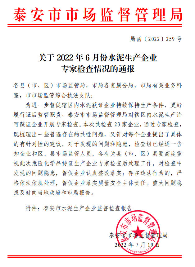 日前,山東泰安市場(chǎng)監(jiān)管局發(fā)布《關(guān)于2022年6月份水泥生產(chǎn)企業(yè)專家檢查情況的通報(bào)》稱,根據(jù)泰安市市場(chǎng)監(jiān)督管理局要求,2022年6月20日至6月27日,山東省建材工業(yè)協(xié)會(huì)從山東省建材行業(yè)專家?guī)斐榕尚袠I(yè)專家參與2022年泰安市水泥生產(chǎn)企業(yè)專家檢查工作。