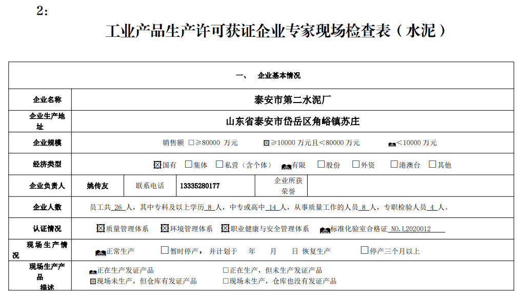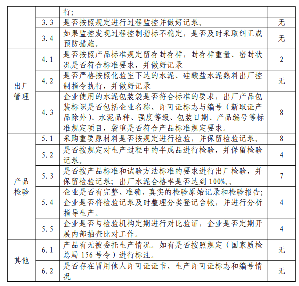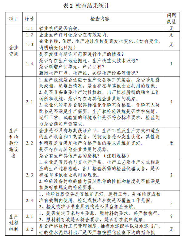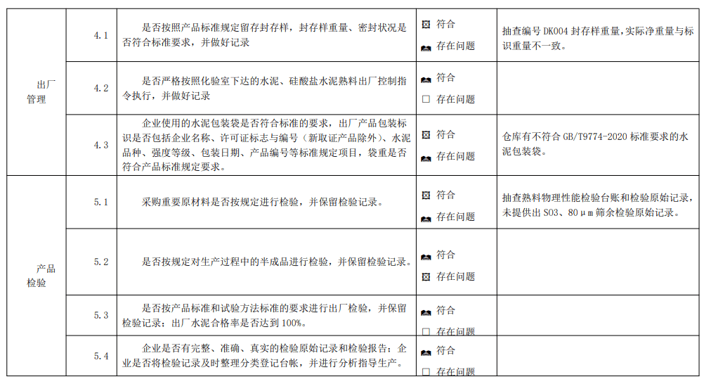本次檢查為生產(chǎn)企業(yè)現(xiàn)場(chǎng)實(shí)地檢查,檢查范圍為泰安市工業(yè)產(chǎn)品生產(chǎn)許可獲證水泥企業(yè)(共計(jì)23家),檢查組由山東省建材工業(yè)協(xié)會(huì)的行業(yè)專家和市、區(qū)兩級(jí)市場(chǎng)監(jiān)管部門執(zhí)法人員組成,主要通過聽取企業(yè)匯報(bào)、查閱有關(guān)資料、詢問相關(guān)人員、巡視生產(chǎn)現(xiàn)場(chǎng)等形式,對(duì)獲證企業(yè)應(yīng)當(dāng)具備的資質(zhì)條件、質(zhì)量保證體系的建立和運(yùn)行情況、生產(chǎn)工藝、產(chǎn)品質(zhì)量控制以及企業(yè)落實(shí)產(chǎn)品質(zhì)量、生產(chǎn)許可等政策法規(guī)情況進(jìn)行檢查。檢查結(jié)束后,當(dāng)場(chǎng)反饋檢查結(jié)果,提出整改意見和建議,并組織檢查人員、企業(yè)負(fù)責(zé)人及當(dāng)?shù)乇O(jiān)管部門工作人員共同對(duì)檢查結(jié)果簽字確認(rèn)。