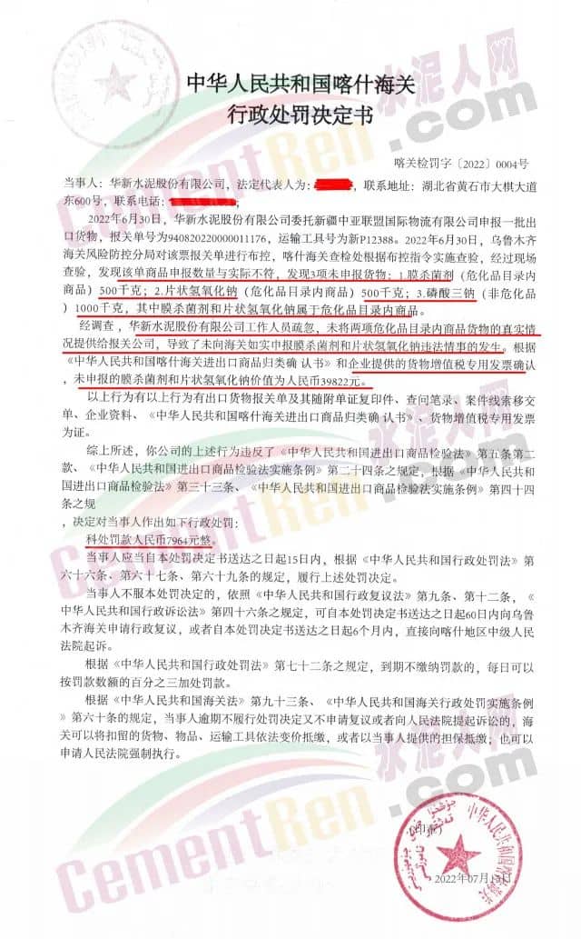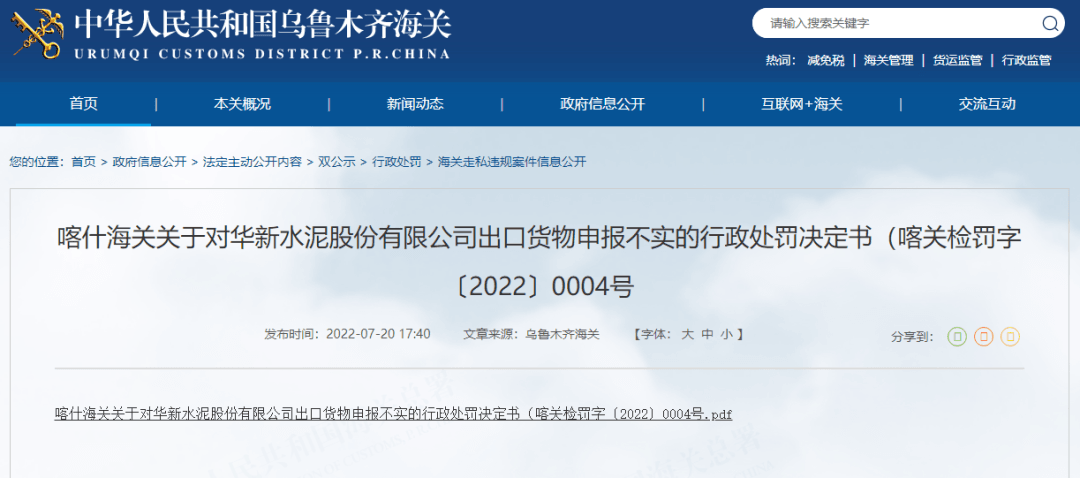日前,烏魯木齊海關(guān)發(fā)布一則行政處罰決定書,其中提到2022年6月30日,華新水泥股份有限公司委托新疆中亞聯(lián)盟國際物流有限公司申報一批出口貨物,報關(guān)單號為9408202200001176,運輸工具號為新P12388。