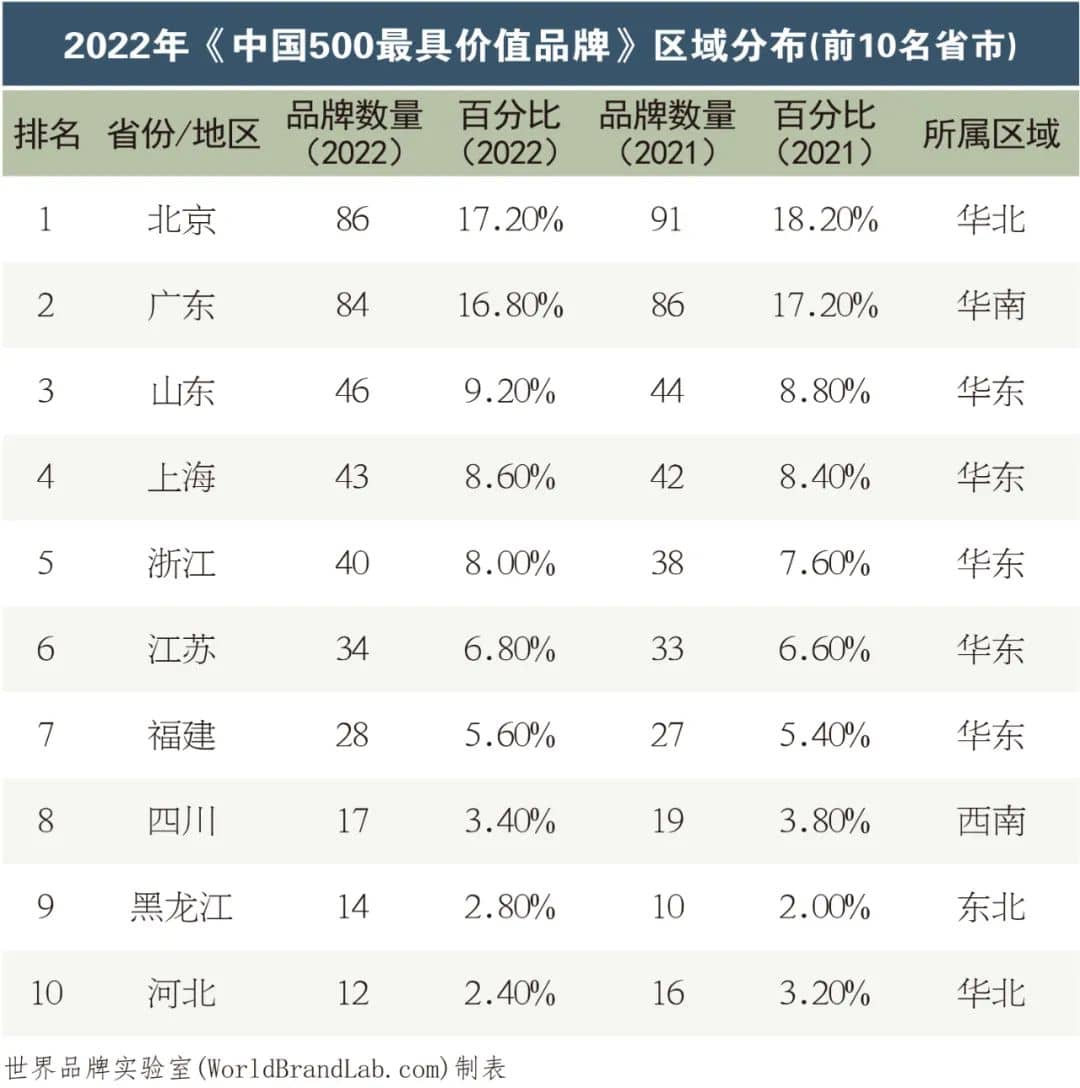 據(jù)世界品牌實驗室分析,一個區(qū)域的競爭實力,主要取決于其比較優(yōu)勢,而品牌效益直接影響著地區(qū)比較優(yōu)勢的形成和發(fā)展。品牌是一個地區(qū)發(fā)展的重要標志,品牌帶動區(qū)域經(jīng)濟的增長,區(qū)域經(jīng)濟的發(fā)展又促進當?shù)仄放频某砷L。從本屆《中國500最具價值品牌》區(qū)域分布來看,北京有86個品牌入選,名列第一,主要原因是贏利能力強的央企總部集中在北京;廣東和山東分別有84個和46個品牌入選,位居第二和第三。根據(jù)入選品牌影響力范圍大小,可按照全國性、世界性品牌進行劃分。榜單中具有全國范圍影響力的品牌有438個,占87.60%;具有世界性影響力的品牌數(shù)為62個,占12.40%,比去年略有增加。