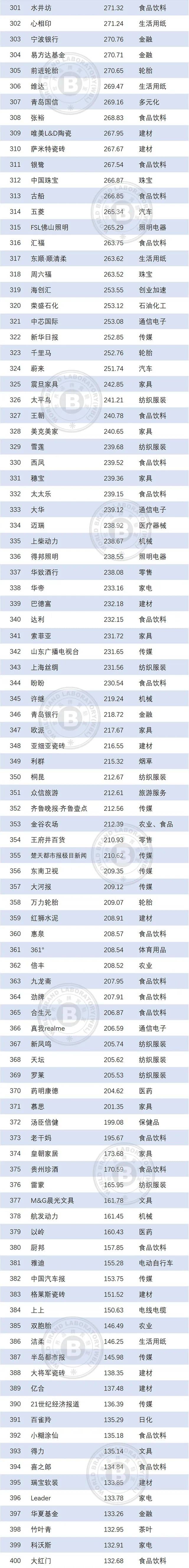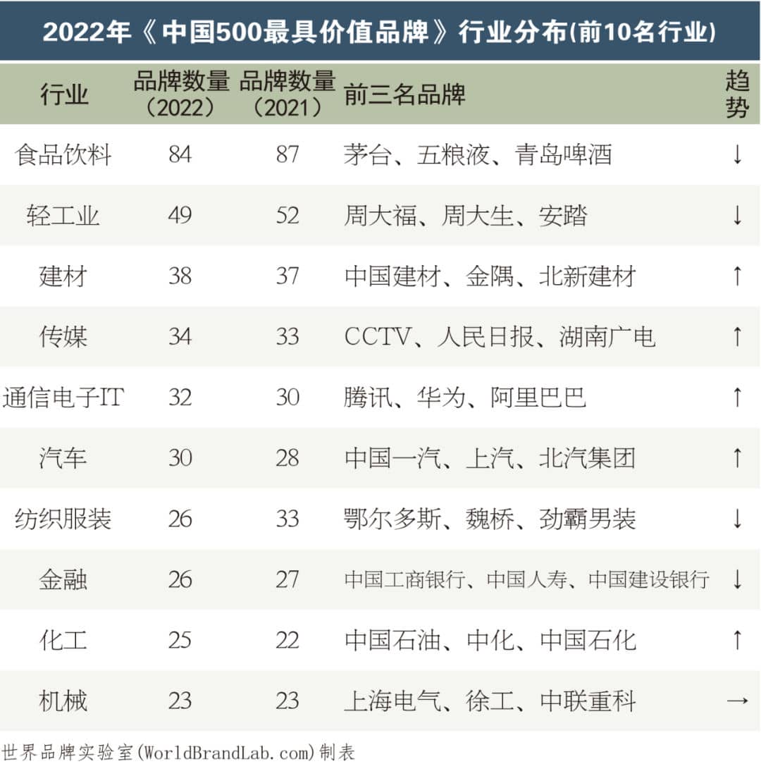 盡管新冠疫情沒有阻擋中國品牌價值整體上升的趨勢,但是與去年相比,航空、旅游服務(wù)、紡織服裝、地產(chǎn)、零售等受疫情影響大的行業(yè)入榜品牌數(shù)量均出現(xiàn)下降,而汽車、通信電子IT、農(nóng)業(yè)等行業(yè)入榜品牌均有不同程度增加。本年度《中國500最具價值品牌》排行榜中,共有來自食品飲料、輕工業(yè)、建材、傳媒、紡織服裝、醫(yī)藥、機械等在內(nèi)的25個相關(guān)行業(yè)的品牌入選。其中食品飲料業(yè)依然是入選品牌最多的行業(yè),共有84個品牌入選,占總?cè)脒x品牌數(shù)的16.80%;入選數(shù)量位居第二到第五的行業(yè)分別是輕工(49個)、建材(38個)、傳媒(34個)、通信電子IT(32個)。本年度共有69個中國品牌的價值超過1000億,比去年增加了12個。