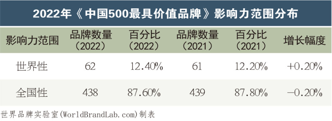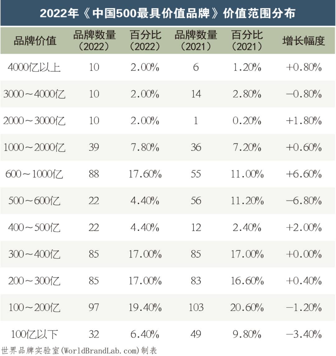 2022年《中國500最具價值品牌》的總價值為309728.07億元,比去年增加30774.87億元,增加幅度為11.03%。世界品牌實驗室學術(shù)委員會主席、牛津大學(Oxford)營銷學榮譽教授斯蒂芬·沃格(Steve Woolgar)表示:“品牌是一個國家的形象,我希望世界上更多的人能夠通過中國品牌了解中國的故事。在過去的17年中,我目睹了中國品牌的快速成長,有的已經(jīng)具有強大的世界影響力”。世界品牌實驗室編制中國品牌報告已是第19個年頭,2004年入選門檻僅為5億元,前500名品牌的平均價值為49.43億元。19年以后的2022年,入選門檻已經(jīng)提高到31.67億元,而前500名品牌的平均價值高達619.46億元,增加幅度為1153.21%。