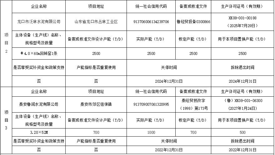 熟料產線產能情況進行公告。項目通過拆除山東聯合王晁水泥有限公司自有2500t/d以及龍口市泛林水泥有限公司2500t/d和泰安魯潤水泥有限公司1000t/d熟料生產線新建一條4000t/d熟料生產線,建設地址位于山東省棗莊市臺兒莊區(qū)澗頭集鎮(zhèn)頓莊村。擬建主體將采用Φ4.6m*72m