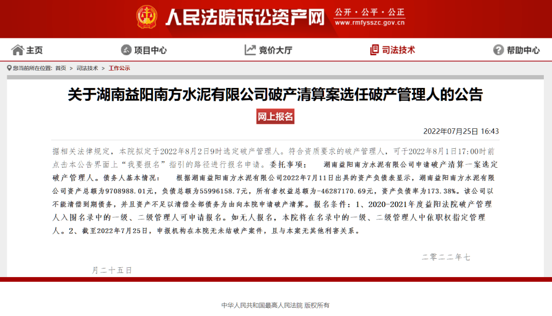 日前,人民法院訴訟資產(chǎn)網(wǎng)發(fā)布《關(guān)于湖南益陽南方水泥有限公司破產(chǎn)清算案選任破產(chǎn)管理人的公告》稱,據(jù)相關(guān)法律規(guī)定,法院擬定于2022年8月2日9時(shí)選定破產(chǎn)管理人。符合資質(zhì)要求的破產(chǎn)管理人,可于2022年8月1日17:00時(shí)前點(diǎn)擊本公告界面上“我要報(bào)名”指引的路徑進(jìn)行報(bào)名申請。