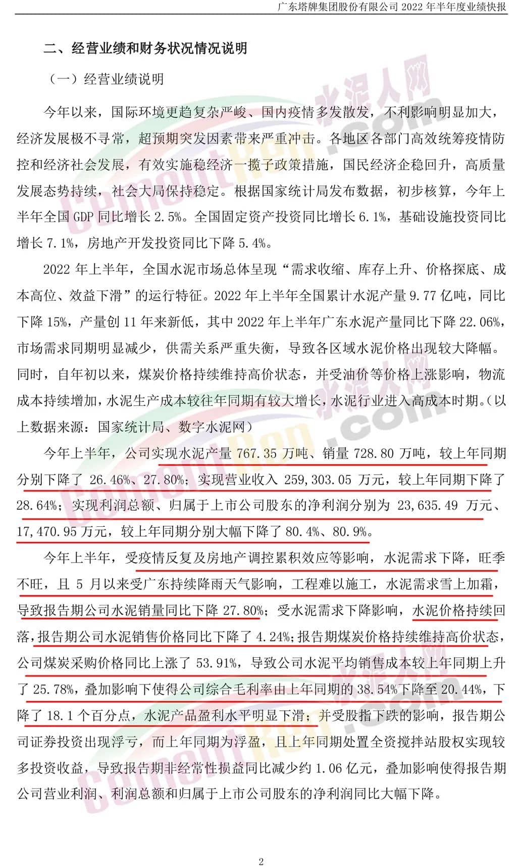 今年上半年,受疫情反復(fù)及房地產(chǎn)調(diào)控累積效應(yīng)等影響,水泥需求下降,旺季不旺,且5月以來(lái)受廣東持續(xù)降雨天氣影響,工程難以施工,水泥需求雪上加霜,導(dǎo)致報(bào)告期公司水泥銷量同比下降27.80%;受水泥需求下降影響,水泥價(jià)格持續(xù)回落,報(bào)告期公司水泥銷售價(jià)格同比下降了4.24%;報(bào)告期煤炭?jī)r(jià)格持續(xù)維持高價(jià)狀態(tài),導(dǎo)致公司水泥平均銷售成本較上年同期上升了25.78%。
