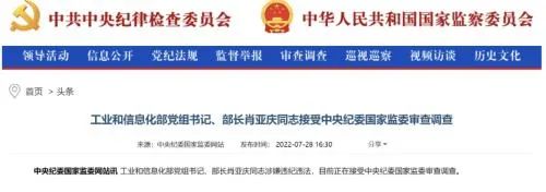 7月28日16時(shí)30分,據(jù)中央紀(jì)委國(guó)家監(jiān)委官網(wǎng)消息,工業(yè)和信息化部黨組書(shū)記、部長(zhǎng)肖亞慶同志涉嫌違紀(jì)違法,目前正在接受中央紀(jì)委國(guó)家監(jiān)委審查調(diào)查。
