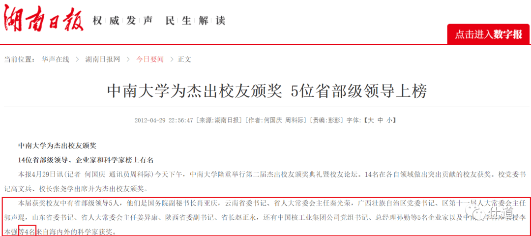 這屆中南大學(xué)的杰出校友評(píng)了14個(gè),當(dāng)時(shí)對(duì)此做報(bào)道的《湖南日?qǐng)?bào)》特別指出,“本屆獲獎(jiǎng)校友中有省部級(jí)領(lǐng)導(dǎo)5人”。