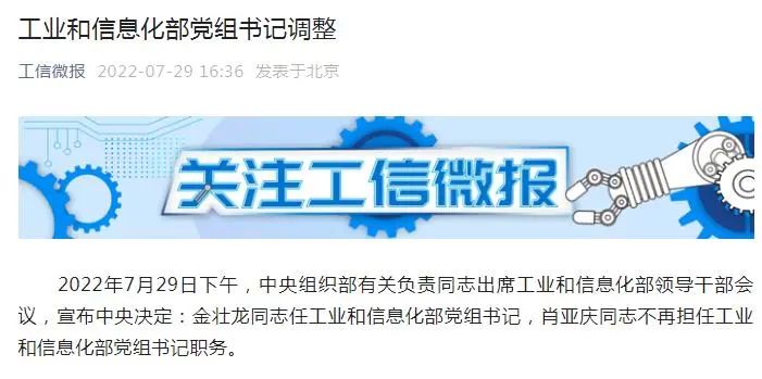 據工信部官方微信消息,2022年7月29日下午,中央組織部有關負責同志出席工業(yè)和信息化部領導干部會議,宣布中央決定:金壯龍同志任工業(yè)和信息化部黨組書記,肖亞慶同志不再擔任工業(yè)和信息化部黨組書記職務。