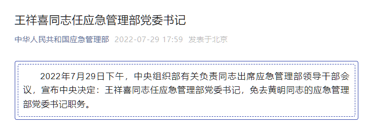 同日 ,應急管理部官微消息:2022年7月29日下午, 中央組織部有關負責同志出席應急管理部領導干部會議, 宣布中央決定:王祥喜同志任應急管理部黨委書記,免去黃明同志的應急管理部黨委書記職務。
