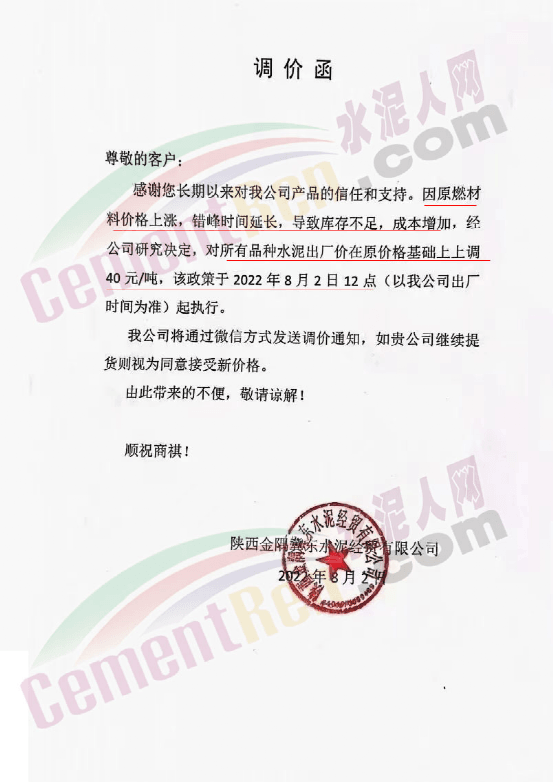 陜西關(guān)中主要品牌企業(yè)通知,上調(diào)水泥價(jià)格40元/噸,其中金隅冀東經(jīng)貿(mào)有限公司通知,因原燃材料價(jià)格上漲,錯(cuò)峰時(shí)間延長(zhǎng),導(dǎo)致庫(kù)存不足,成本增加,經(jīng)公司研究決定,對(duì)所有品種水泥出廠價(jià)在原價(jià)格基礎(chǔ)上上調(diào)40元/噸。該政策于8月2日12點(diǎn)起執(zhí)行。公司將通過(guò)微信方式發(fā)送調(diào)價(jià)通知,如繼續(xù)提貨則視為同意接受新價(jià)格。