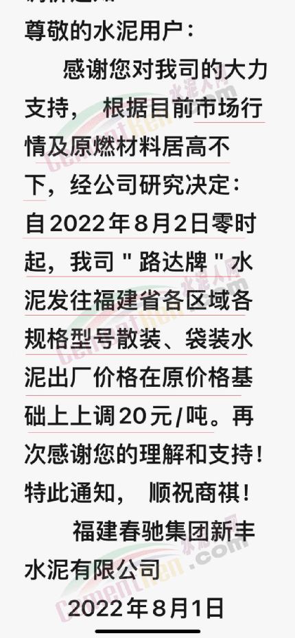 福建春馳集團(tuán)新豐水泥有限公司通知根據(jù)目前市場(chǎng)行情及原燃材料居高不下,經(jīng)公司研究決定自8月2日零時(shí)起,公司“路達(dá)”牌水泥發(fā)往福建省各區(qū)域各規(guī)格型號(hào)散裝、袋裝水泥出廠價(jià)格在原價(jià)基礎(chǔ)上上調(diào)20元/噸。