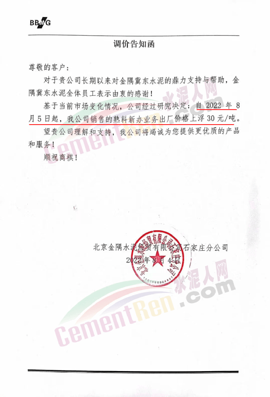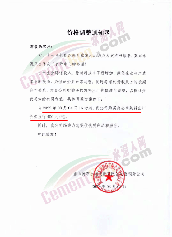 同日,唐山冀東水泥股份有限公司營銷分公司通知,由于企業(yè)環(huán)保投入、原材料成本不斷增加,致使企業(yè)生產(chǎn)成本不斷提高,自8月月4日16時起,熟料出廠價格執(zhí)行400元/噸。