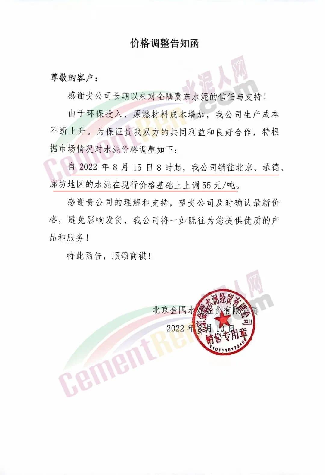 北京金隅水泥經(jīng)貿有限公司通知由于環(huán)保投入,原燃材料成本增加,公司生產(chǎn)成本不斷上升。8月15日8時起,公司銷往北京、承德、廊坊地區(qū)的水泥在現(xiàn)行價格基礎上上調55元/噸。