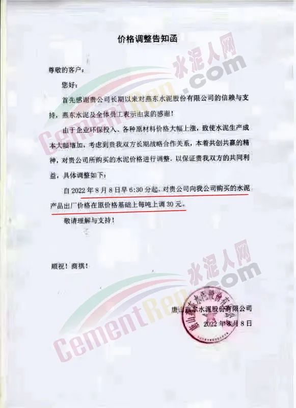 唐山燕東水泥股份有限公司通知由于企業(yè)環(huán)保投入,各種原材料價格大幅上漲,致使水泥生產(chǎn)成本大幅增加。自8月8日6:30分起,公司水泥出廠價格在原基礎上上調30元/噸。