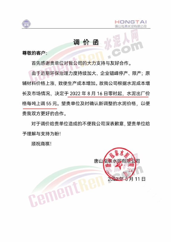 唐山泓泰水泥有限公司通知,由于近期環(huán)保治理力度持續(xù)加大,企業(yè)錯峰停產(chǎn)、限產(chǎn);原輔材料價格上漲,致使生產(chǎn)成本增加。公司根據(jù)水泥成本增長及市場情況,決定于8月16日零時起,水泥出廠價格上調55元/噸。