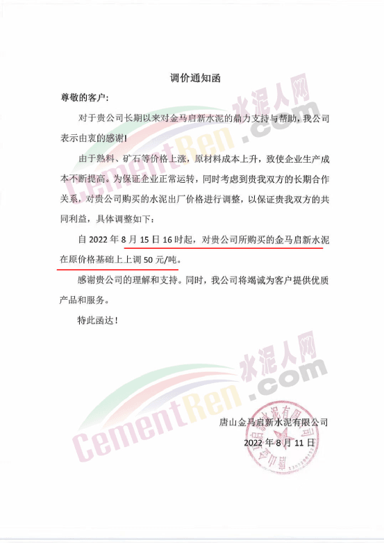 萬年青水泥通知,自8月11日起,上調20元/噸。