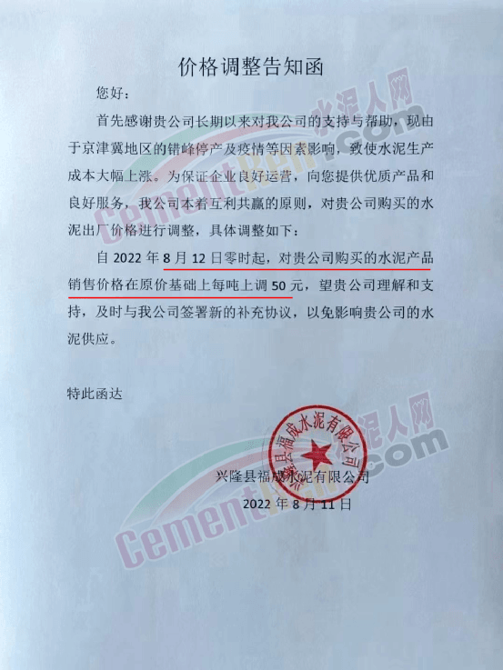興隆縣福成水泥有限公司通知,由于京津冀地區(qū)的錯峰停產(chǎn)及疫情等因素影響,致使水泥生產(chǎn)成本大幅上漲。公司水泥出廠價格自8月12日零時起上調50元/噸。