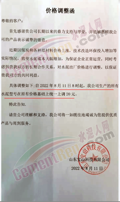 山東寶山科技有限公司通知,因煤炭和各種原材料價格上漲,技術改造環(huán)保投入增加等實際情況,致使水泥成本大幅增加,為保證企業(yè)正常運營,自8月11日8時起,公司生產(chǎn)的所有水泥型號在原價基礎上統(tǒng)一上調20元/噸。