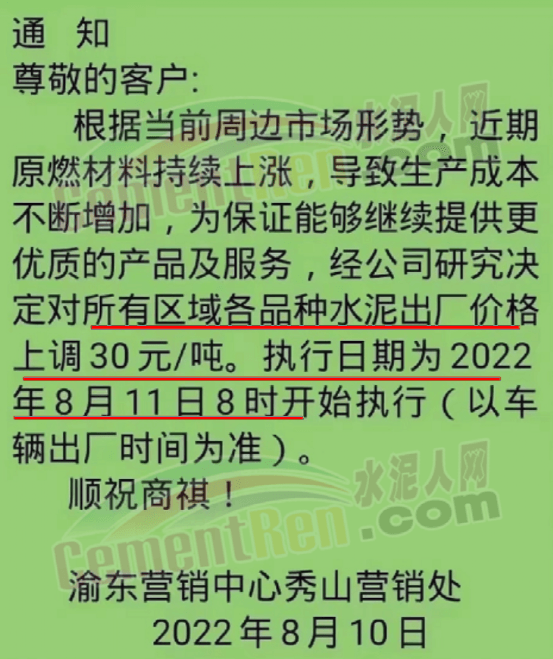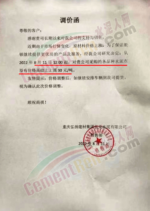 重慶弘揚建材集團弘龍水泥有限公司通知,由于市場行情變化,原材料價格上漲,公司自8月11日12時起上調各品種水泥價格30元/噸。