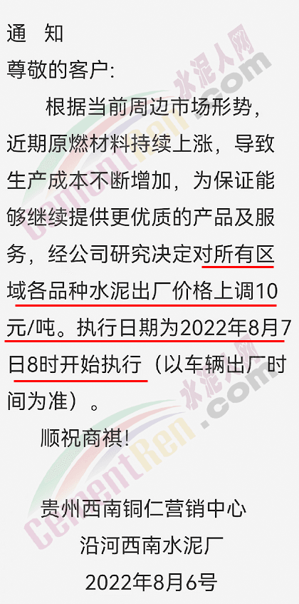 貴州西南銅仁營銷中心沿河西南水泥廠通知根據(jù)當前周邊市場形勢,近期原燃材料持續(xù)上漲,導致生產(chǎn)成本不斷增加,為保證能夠繼續(xù)提供更優(yōu)質的產(chǎn)品及服務,經(jīng)公司研究決定對所有區(qū)域各品種水泥出廠價格上調10 元/噸,執(zhí)行日期為2022年8月7日8時。