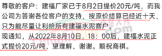 值得一提的是,福建水泥下屬工廠通知客戶稱,建福廠家已于8月2日提價20元/噸,而公司為答謝各位客戶的支持,按原價結算已經(jīng)近十天,只為能盡量讓利給所有建福水泥客戶?,F(xiàn)通知,從2022年8月10日,18時后,建福水泥正式提價20元/噸。