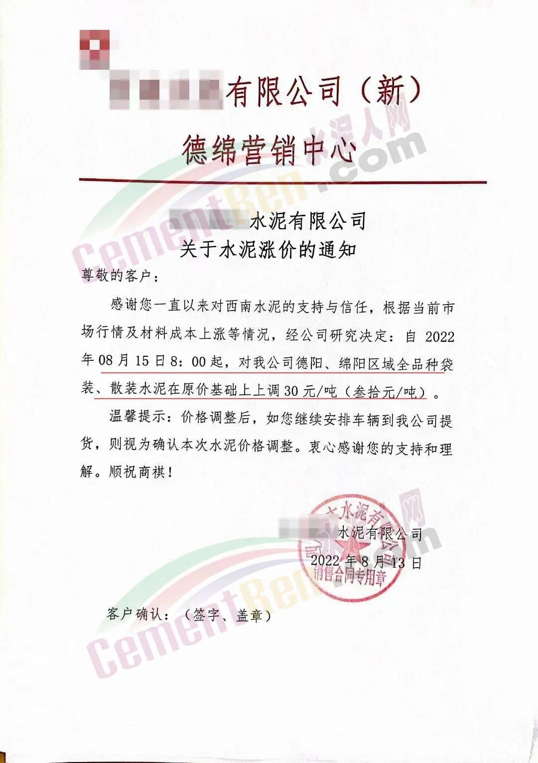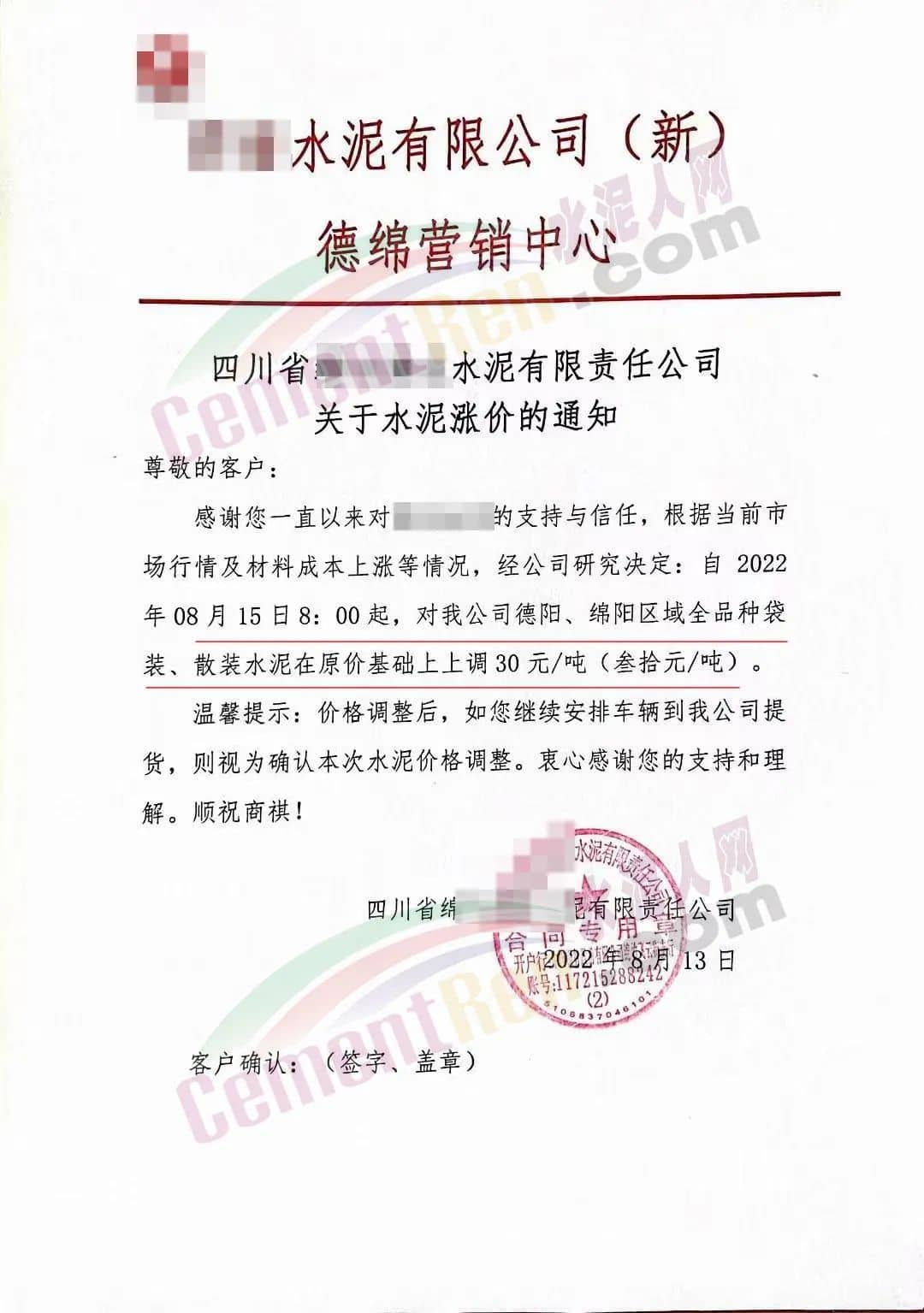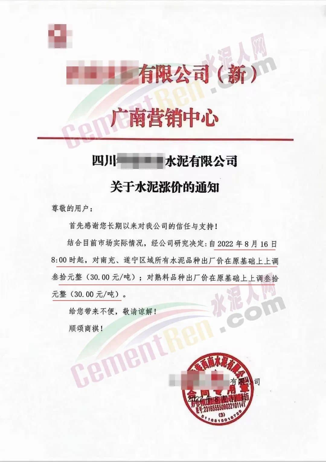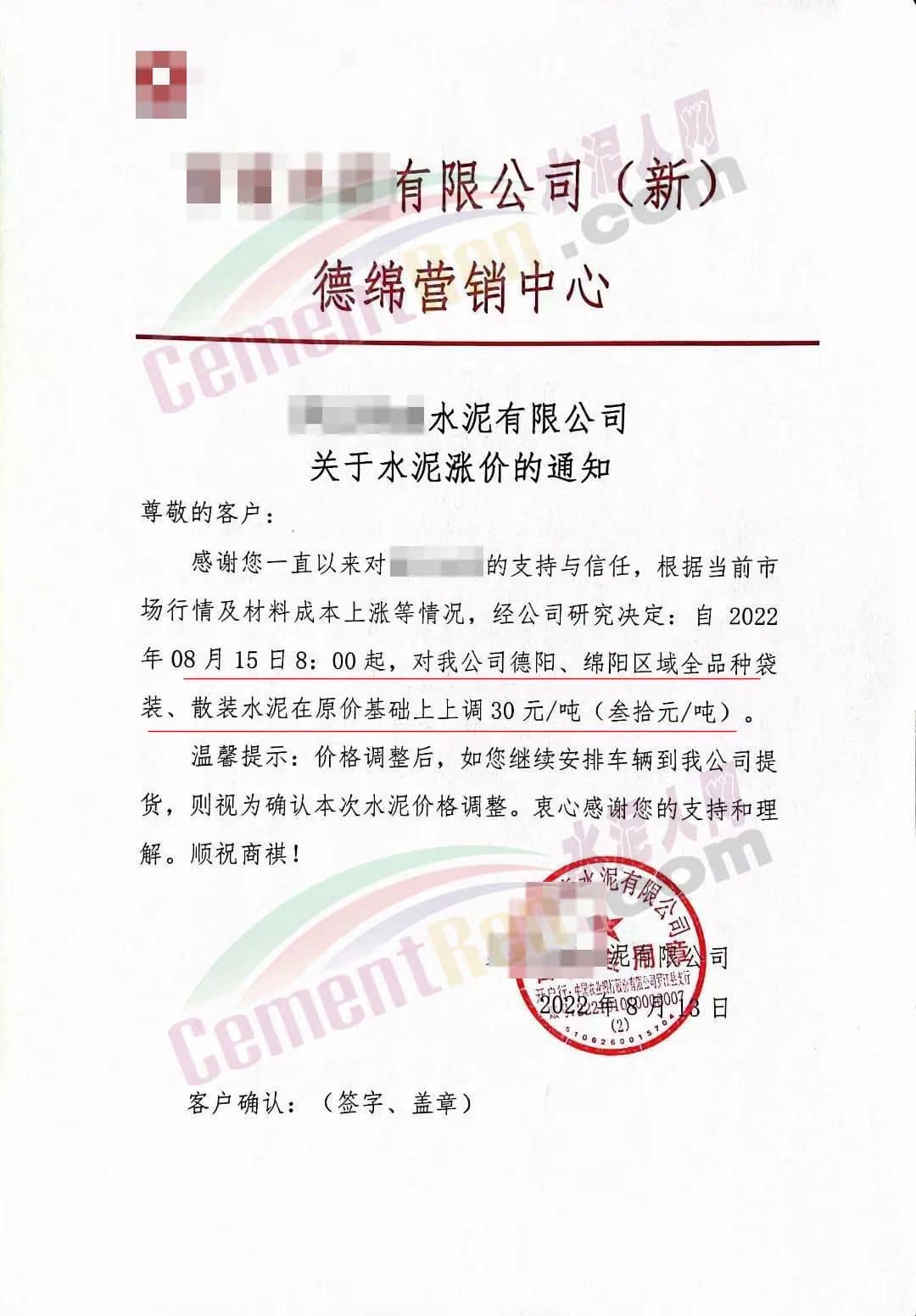 四川金桂蘭水泥有限責(zé)任公司從8月15日零時(shí)起,對德綿區(qū)域各品種、各等級水泥在原價(jià)基礎(chǔ)上上調(diào)30元/噸。