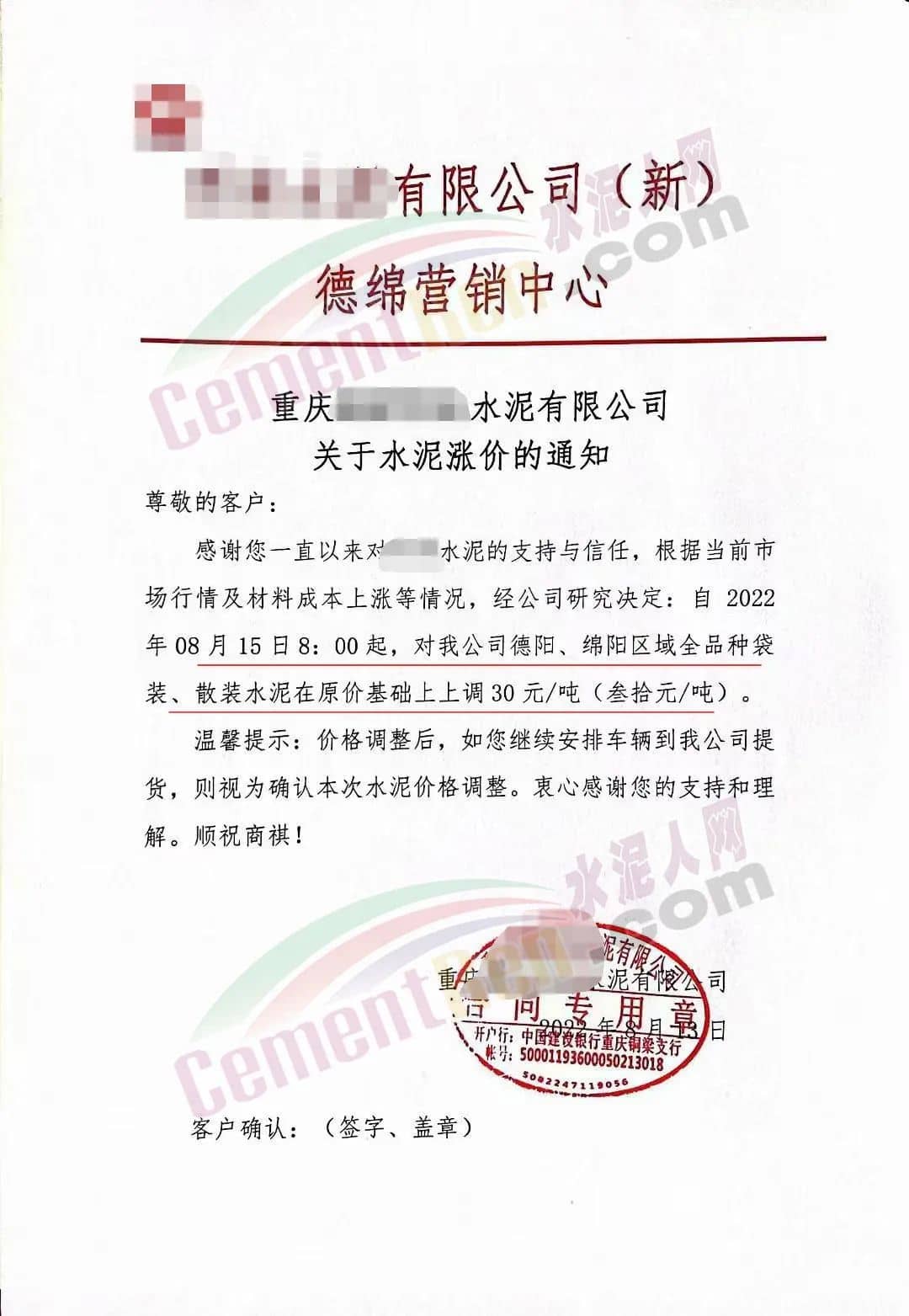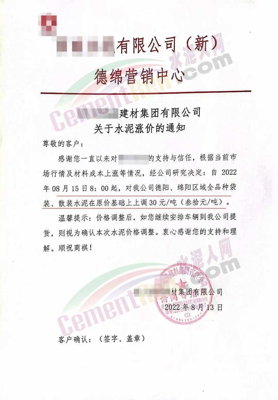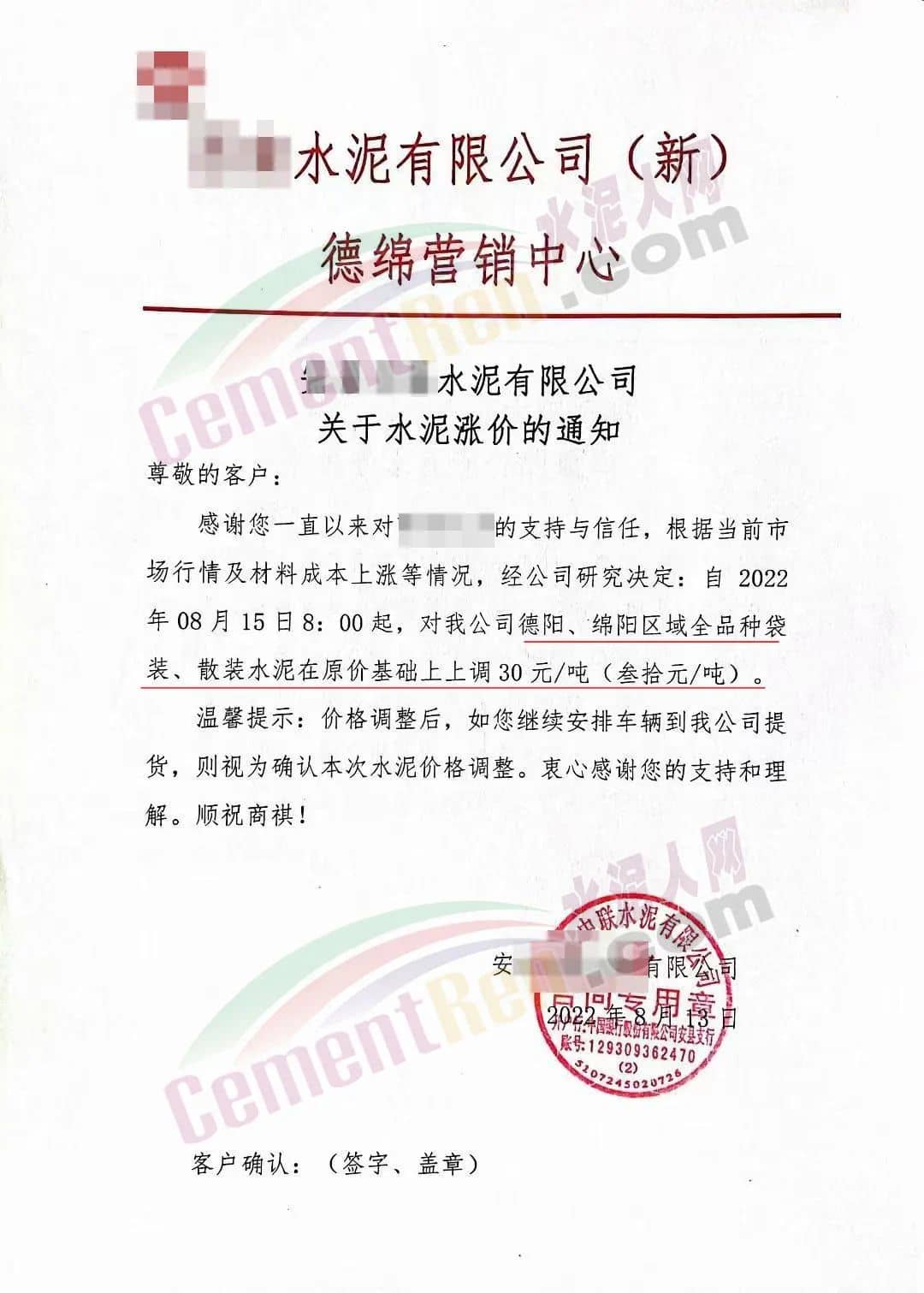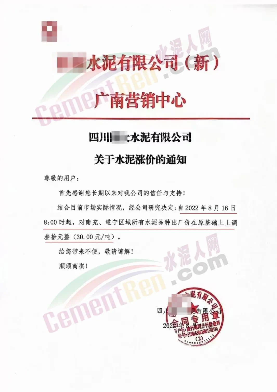 四川金桂蘭水泥有限責(zé)任公司從8月15日零時(shí)起,對德綿區(qū)域各品種、各等級水泥在原價(jià)基礎(chǔ)上上調(diào)30元/噸。