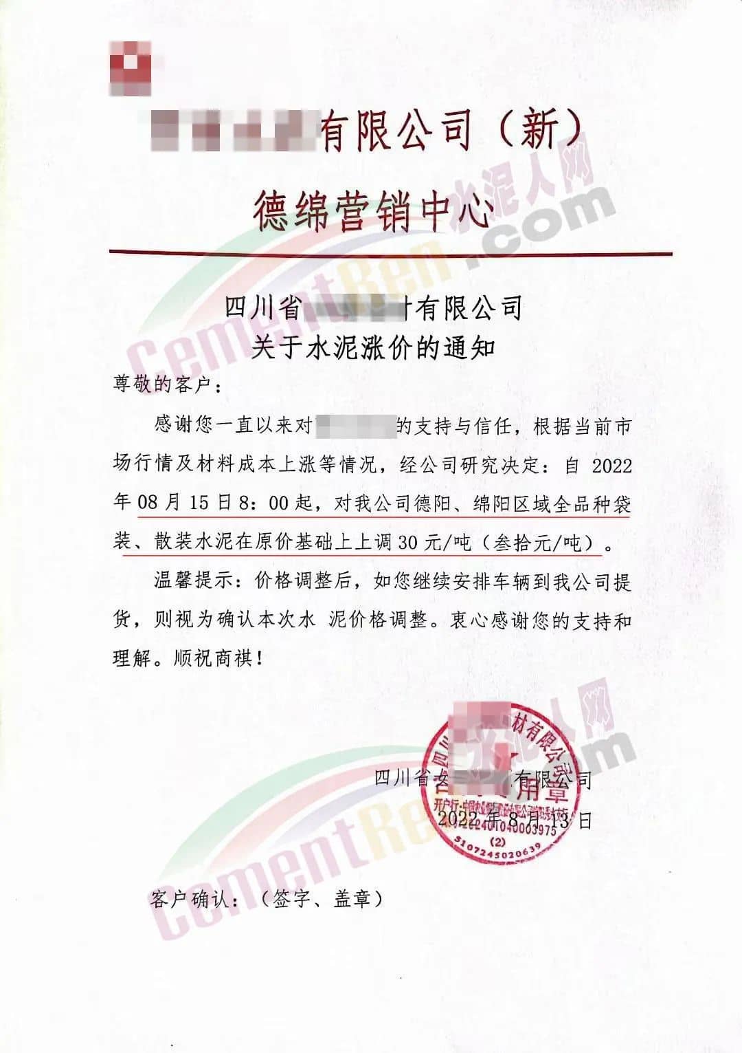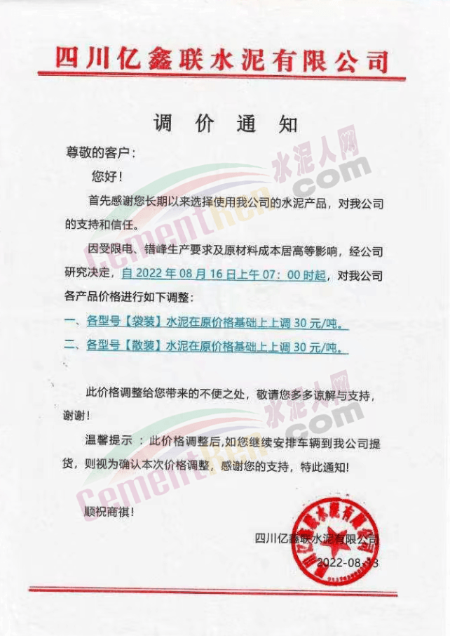 四川億鑫聯(lián)水泥有限公司自8月16日上午7時(shí)起,對公司各產(chǎn)品價(jià)格上調(diào)30元/噸。