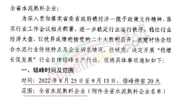 日前,河北省建筑材料工業(yè)協(xié)會發(fā)布《關于河北省水泥熟料企業(yè)開展穩(wěn)增長促發(fā)展行業(yè)自律錯峰生產(chǎn)的通知》,是覅有河北全省水泥熟料企業(yè)自2022年8月25日~9月13日,錯峰停窯20天。