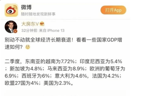 但是,對于部分媒體和吃瓜群眾在強調的“全球經(jīng)濟衰退”,有人是不同意的。新浪博主@大房東表示:別動不動就全球經(jīng)濟長期衰退,看看一些國家GDP增速如何?